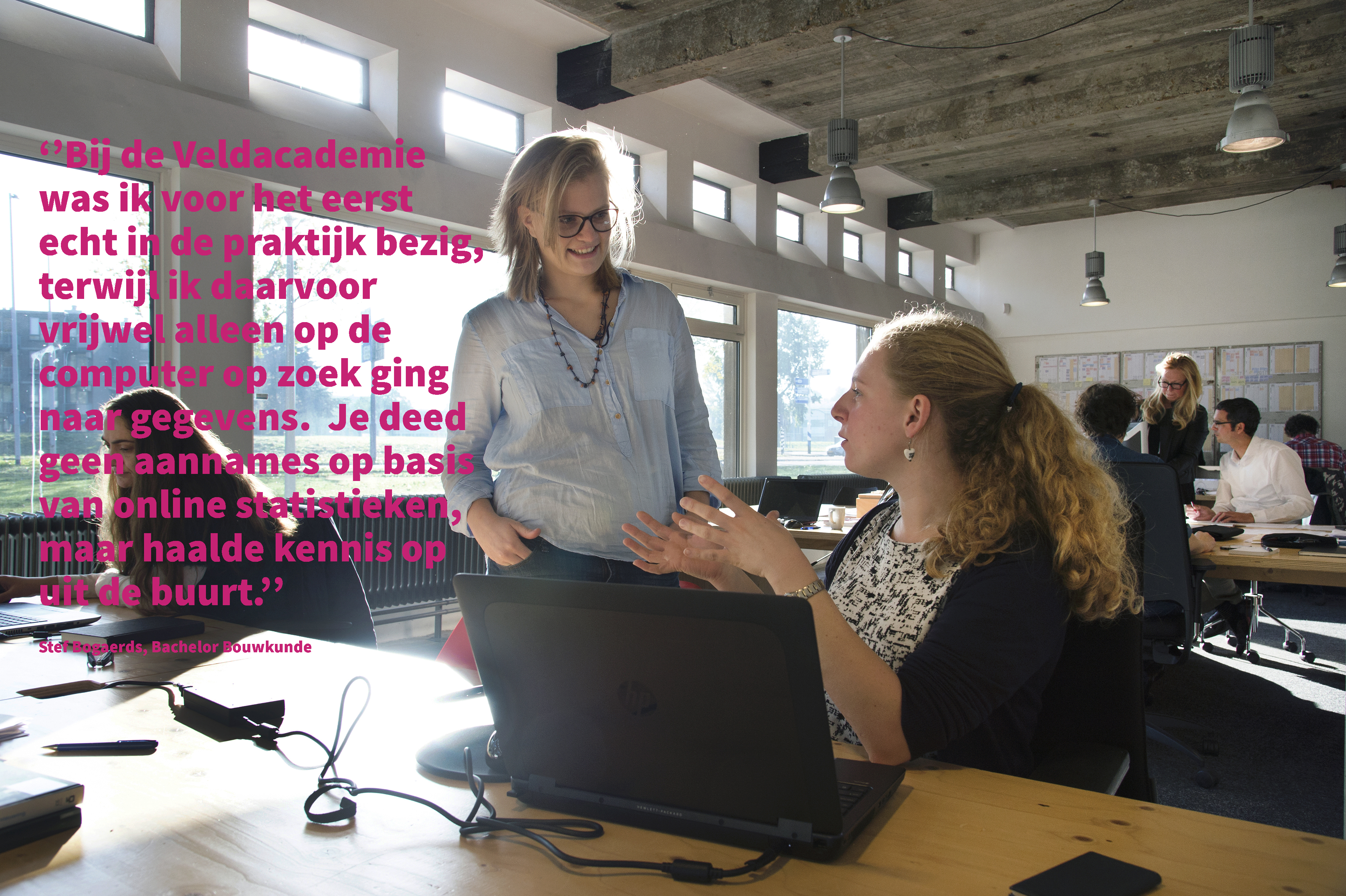 Voor de opleiding Bouwkunde aan de TU Delft heeft Veldacademie een eigen afstudeerstudio. Hier kun je een sociaal-ruimtelijke opgave ontwikkelen. Bij ons werk je op locatie in Rotterdam met studenten van verschillende opleidingen aan concrete opdrachten van publieke en private partijen. Dit doe je door actief op zoek te gaan naar de context van de opgave en in gesprek te gaan met diverse betrokkenen. Daarmee is Veldacademie letterlijk een academie in het veld.