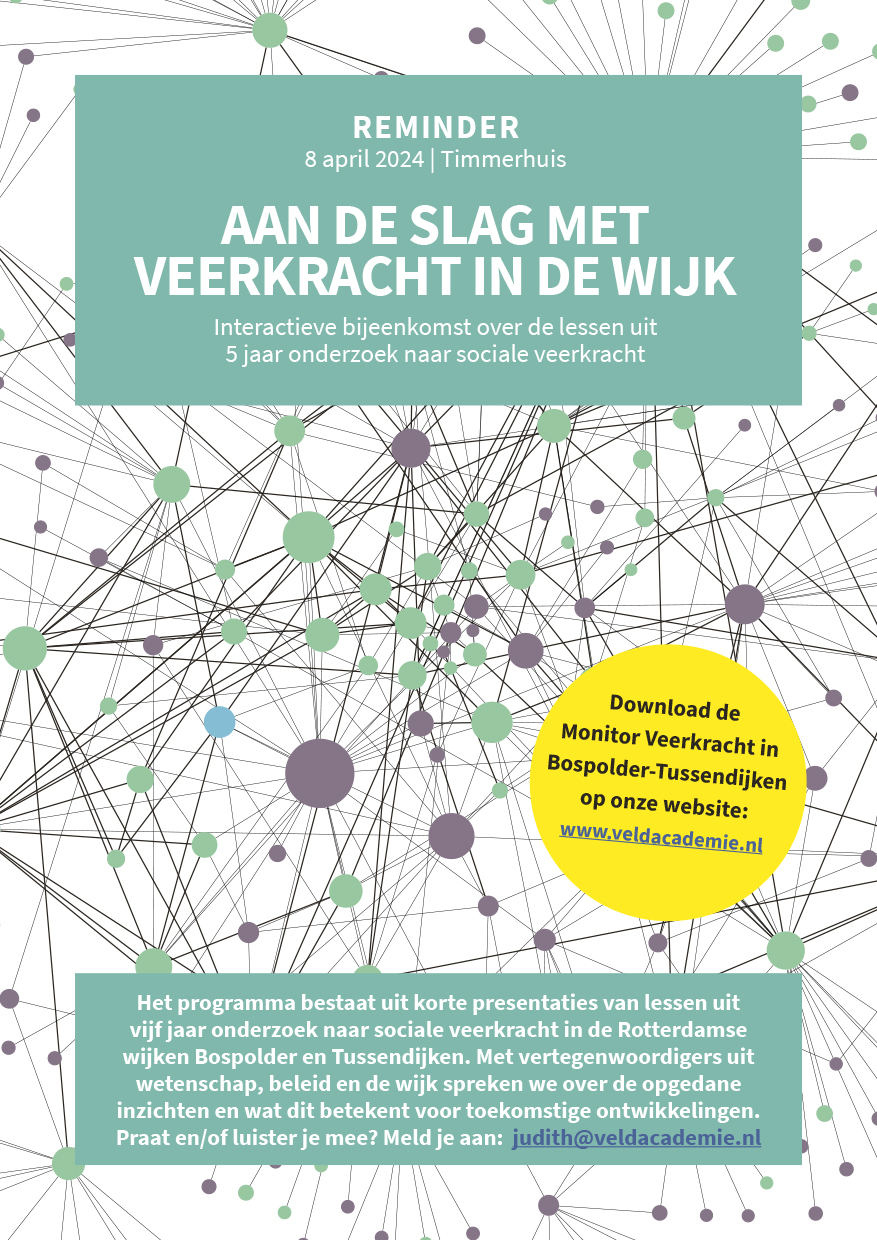 Veldacademie presenteert op maandag 8 april lessen uit vijf jaar onderzoek naar sociale veerkracht in de Rotterdamse wijken Bospolder-Tussendijken. In de context van de huidige wijkontwikkelingen (Wijk aan Zet) en het belang van participatie, werken veel professionals aan beleidsplannen en -programma’s. Met vertegenwoordigers uit wetenschap, beleid en de wijk spreken we over de opgedane inzichten en wat dit betekent voor toekomstige ontwikkelingen. Wij nodigen je van harte uit om samen het gesprek te voeren over veerkracht en met elkaar te leren.