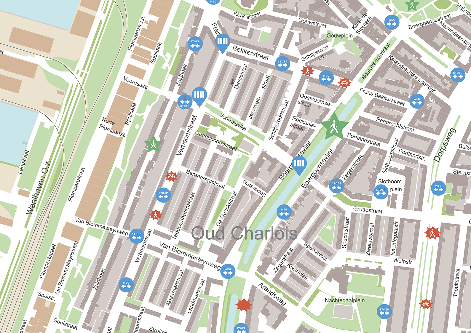 Bewoners van Oud-Charlois komen dagelijks gevaarlijke verkeerssituaties tegen in de wijk. Dit maakt de wijk waarin zij wonen minder prettig om in te bewegen. Stichting Charlois aan de Vliet is een bewonersinitiatief opgericht door bewoners van de Boergoensevliet in Oud-Charlois. De stichting is zeer actief als het gaat over de instandhouding van groen en water, verkeersveiligheid en de leefbaarheid in de wijk. Ze ontwikkelen (ruimtelijke) plannen die ze voorstellen bij de gemeente, in de hoop de wijk te verbeteren. Zo zijn er recent meerdere ideeën bedacht om de verkeerssituatie op de Boergoensevliet te verbeteren. De Gemeente Rotterdam wil in goed overleg aan de slag met die ideeën maar vindt het belangrijk de mobiliteitsopgave breed aan te vliegen. Delen andere bewoners uit de wijk de ideeën van de bewonersgroep en zorgen de voorgestelde interventies niet voor opstoppingen in andere delen van de wijk? De gemeente wil hier eerst onderzoek naar laten doen en heeft Veldacademie gevraagd dit onderzoek uit te voeren. Waar de focus tot nu toe heeft gelegen op het ophalen van bewonerservaringen, heeft dit onderzoek uiteindelijk als doel om tijdelijke ruimtelijke interventies uit te voeren en te testen om de verkeersveiligheid voor fietsers en voetgangers te verbeteren.