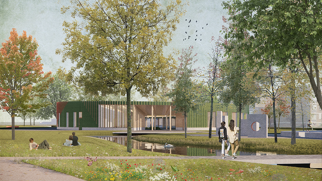 Deze kenmerken zijn opnieuw geïnterpreteerd en nieuw leven ingeblazen. Door het ontwerp van een centraal meanderend pad met meerdere aftakkingen wordt het park weer geactiveerd. Een secundaire route sluit aan op het meer actief geprogrammeerde deel van het park en leidt naar het jeugdcentrum. Het wilde en natuurlijke karakter wordt teruggebracht in het park door de wateroevers glad te maken en gevarieerde vegetatie toe te voegen. Het radiale grid van het jeugdcentrum is de basis voor de organisatie van functies en paden in het park. De specifieke locatie van het gebouw wordt bepaald door de waterpartij die het aan drie zijden omsluit; verbonden met het momenteel ongebruikte basketbalveld en de skatebaan. Het is ook de huidige locatie van buurttuin Oeverloos.
