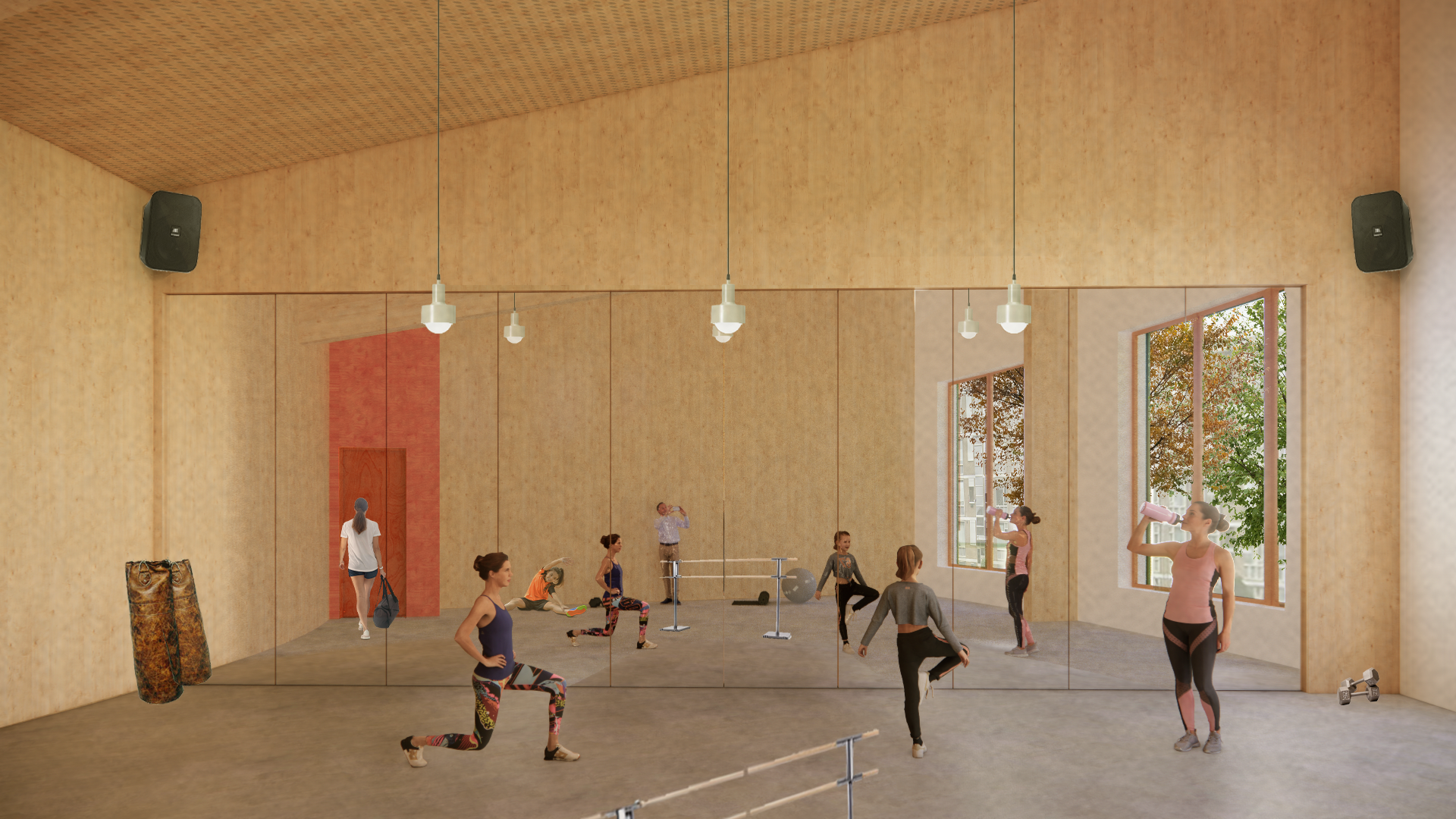 Hoewel het grootste deel van het actieve programma buiten is ondergebracht om de drempel laag te houden en die functies ook na sluitingstijd te kunnen gebruiken, huisvest het centrum wel kleedkamers en een multifunctionele ruimte die bijvoorbeeld kan dienen als danszaal, yogastudio, of boks studio.