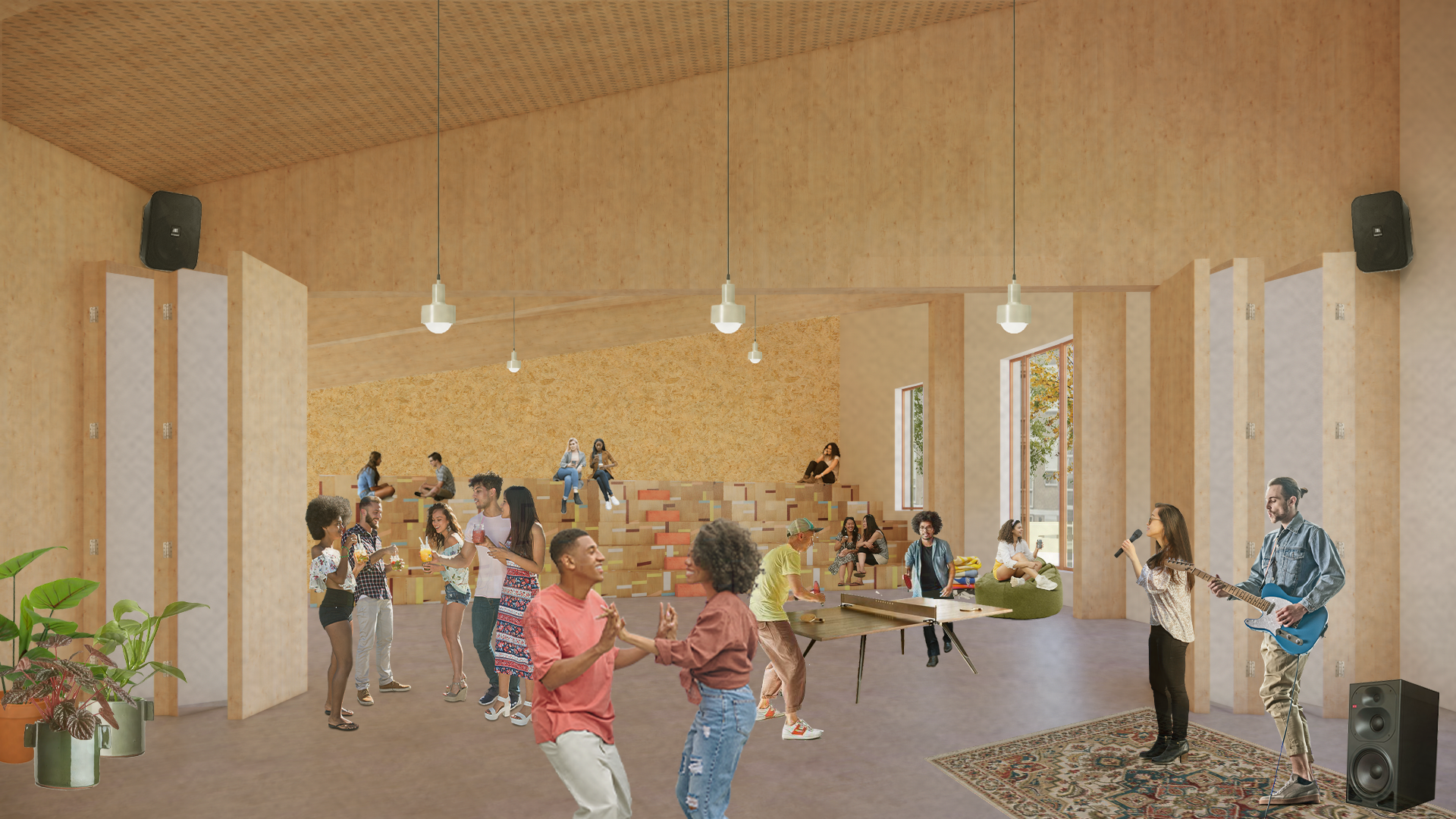 Aangezien ‘hangen’ de belangrijkste tijdsbesteding van jongeren is, zal het ontwerpen van ruimtes die dat faciliteren er ook in hoge mate toe bijdragen dat jongeren er graag komen. Daarom huisvest het centrum een café met een groot terras, en een multifunctionele hangplek die eens per week dienstdoet als bioscoop en die kan worden uitgebreid door de vouwdeuren van de sportruimte te openen voor grotere evenementen. Interieurelementen zoals de tribune zijn gemaakt van oude gymnastiekvloeren als knipoog naar beweging, waardoor een verrassend patroon ontstaat en de ruimte kleur krijgt.