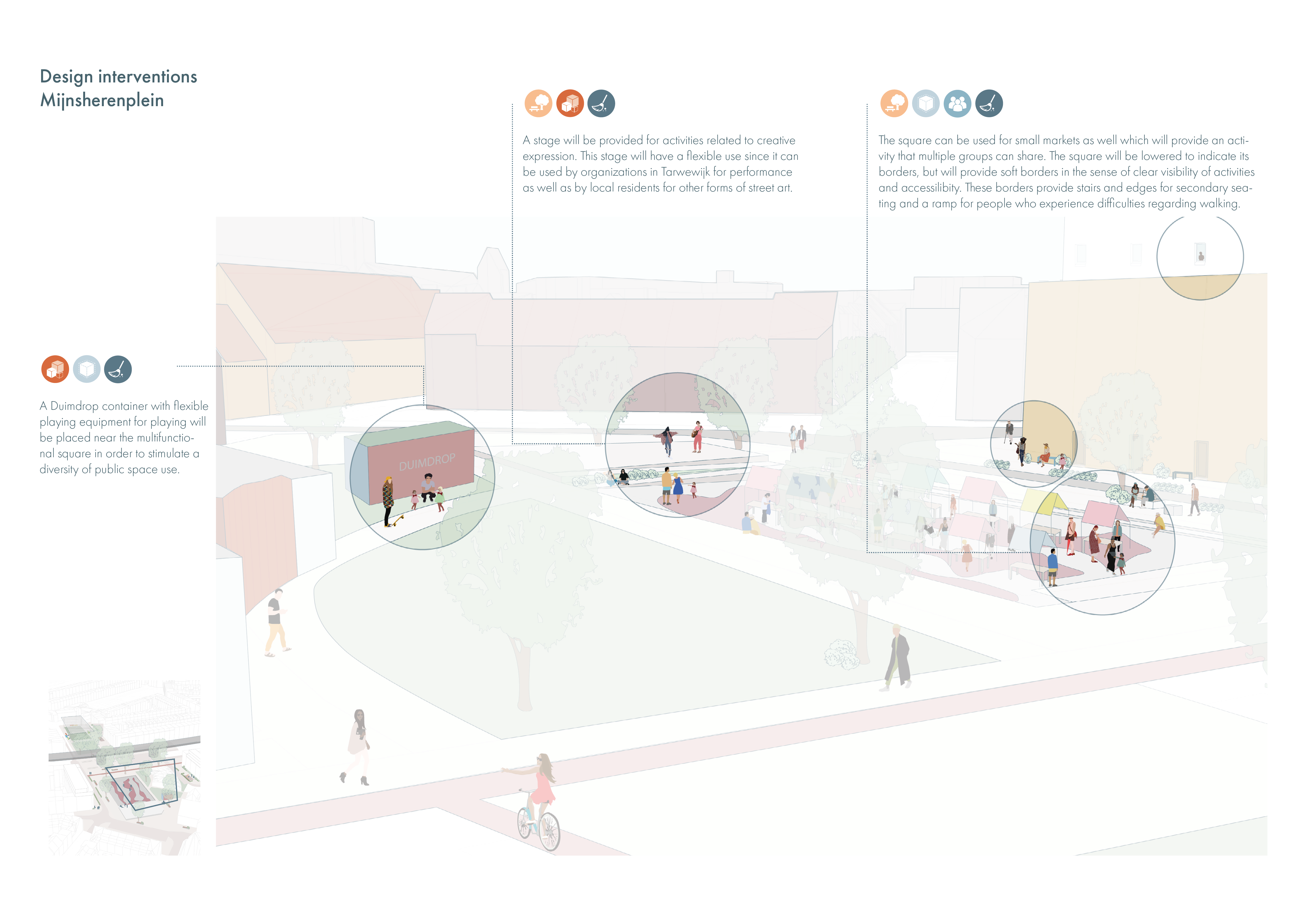 Firstly, harmonization is about finding a balance in facilitating a public space for everyone, while at the same time preventing them from becoming segregated. Such harmonization can be achieved by offering ‘rooms’ with soft borders in the public space that differ in the degree of public-ness. Secondly, in the context of a hyper-diverse population such as Tarwewijk, the question still remains on how to bring these people together. Creating possibilities for encounters between people is done through a multi-layer approach. Despite the differences within the population of the Tarwewijk, there are also a lot of recognisable relationships. People are related to each other on different levels. By identifying these commonalities, it is possible to facilitate community integration. This graduation project chose one such layer, namely age, to enhance more encounters between people. Lastly, in order to let people appropriate public space in the neighbourhood, it is necessary to recognise people’s needs and wishes regarding the use of the public space.