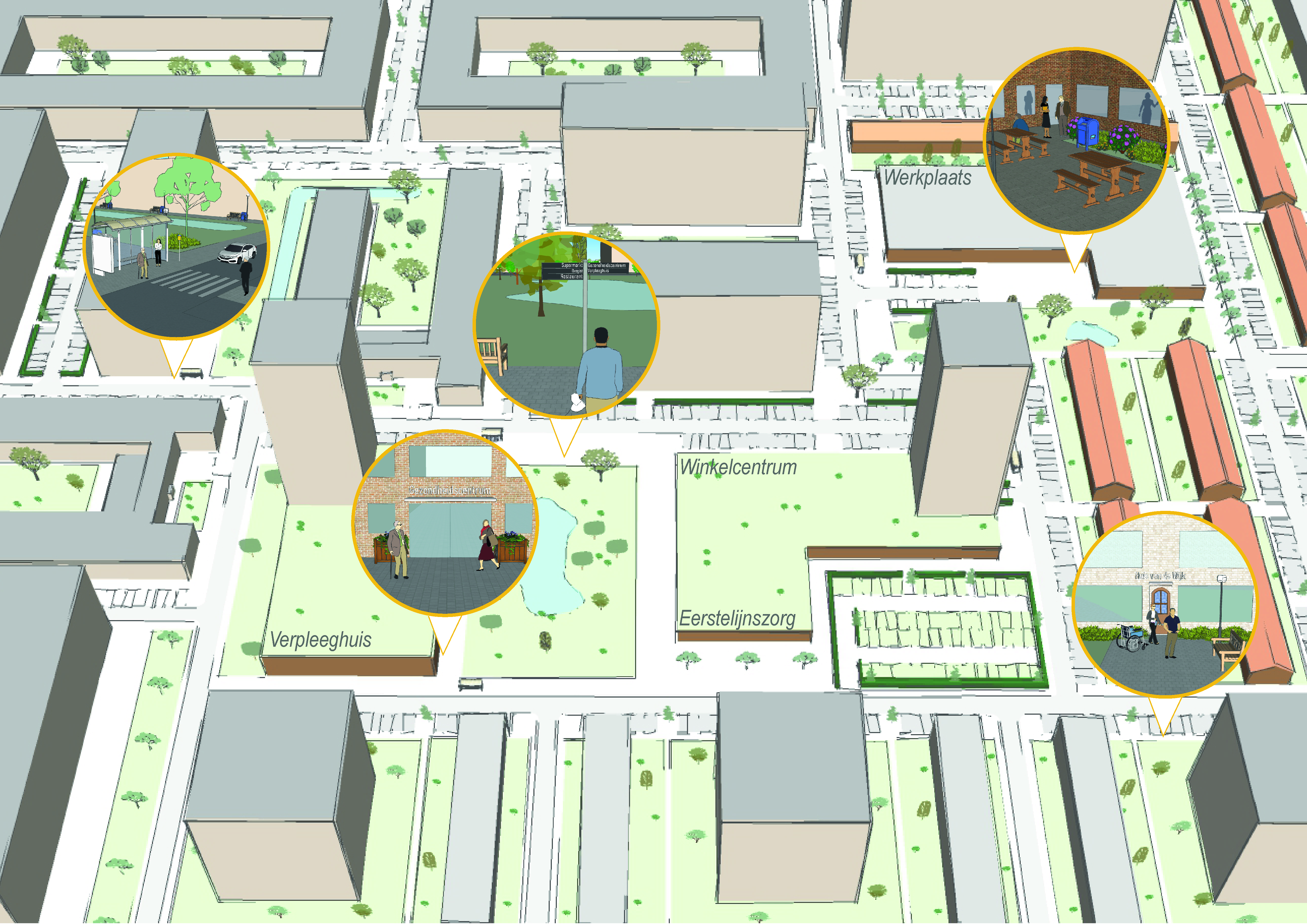 Aan de hand van deskresearch heeft Jenny eerst gezocht naar de kern van dit probleem. Hieruit bleek dat de toename van de vergrijzing en het bevolkingsaantal geen gelijkmatige ontwikkelingslijn bevatten waardoor een ouderenhub niet overal op dezelfde manier kan worden toegepast. Deze ontwikkelingen heeft zij daarom uitgewerkt aan de hand van een scenariostudie. De scenariostudie gaat van start met een nulmeting. Dit bedraagt een fictieve wijk waar het concept ‘Ouderenhub 1.0’ op is toegepast. Vervolgens zijn de scenario’s toegepast op deze nulmeting en laten dus zien hoe zo’n gebied zich verder ontwikkeld.