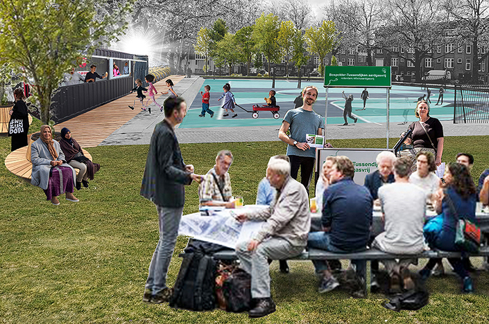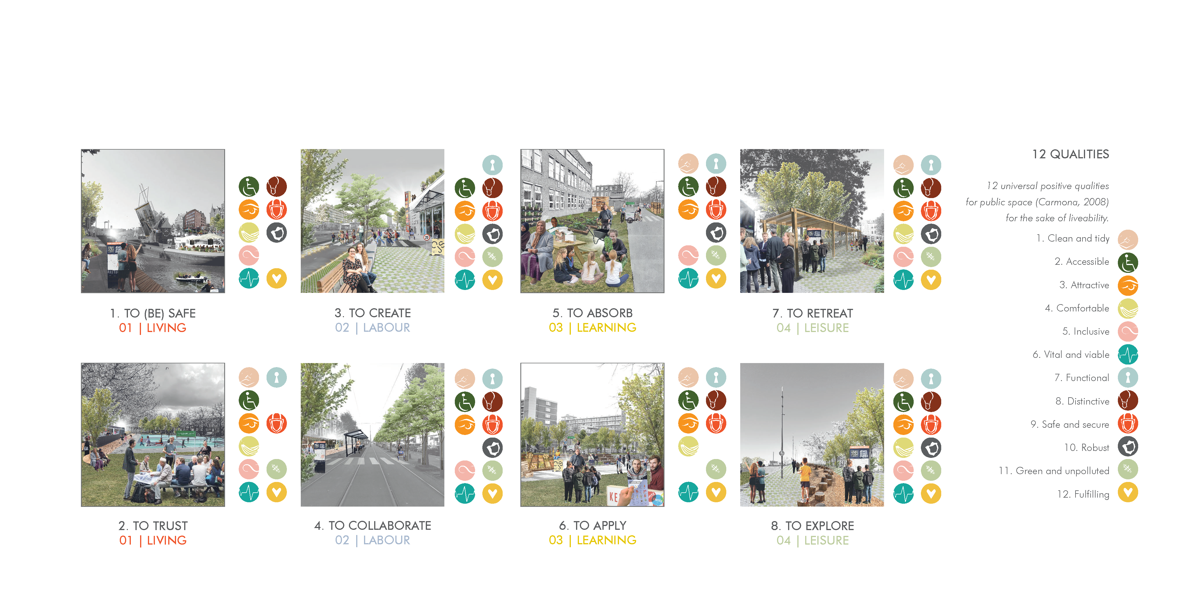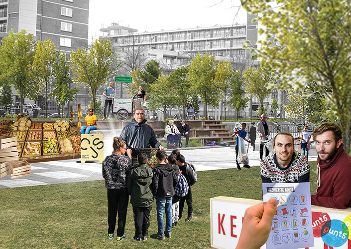 Her goal was to develop a solution-oriented approach for a co-creative process in focus neighbourhoods and to translate that visually and practically. An approach that aims at not 'pre-defining' administrative boundaries but create a more flexible, practical and visual interpretation of a powerful network of initiatives that already exists in the residential districts. Through spatial design scenarios for four domains of social life (living, labour, learning, and leisure), Maud shows synergies within the network of initiatives, in order to reclaim (semi)public space, encourage encounters and create safety, trust and peace.