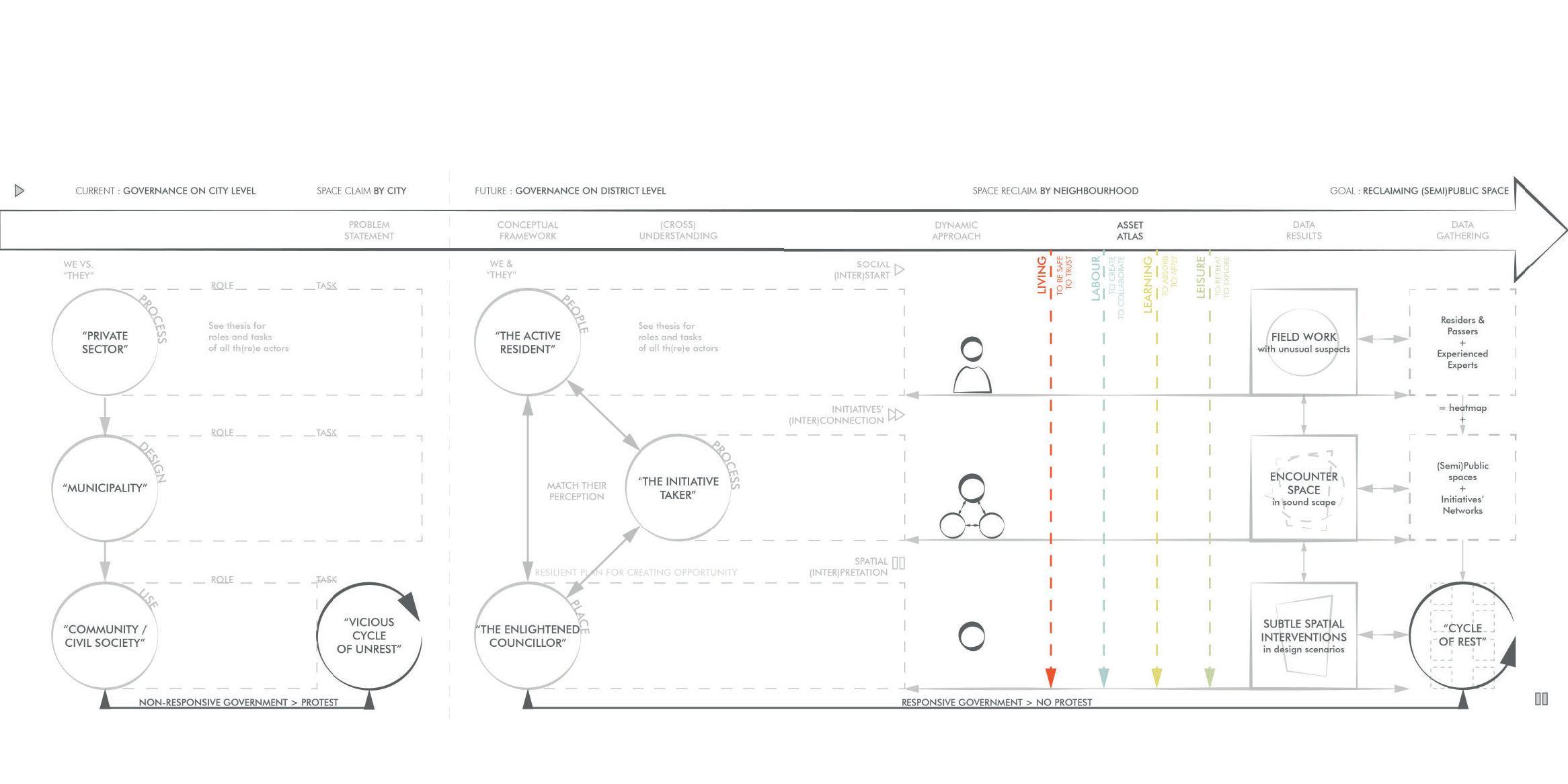 Socio-spatial character is paradoxical. Social unrest creates a lack of responsibility to sustain and maintain the (semi)public space, causing a vicious cycle of unrest. Overstimulation with (sustainable or resilient) development plans sensitizes and therewith stigmatizes the neighbourhood. Residents are aware of this stigmatization and often find themselves in a self-fulfilling prophecy, not taking care of their surroundings. Passengers and residers move through the neighbourhood with shifting motives related to four domains of social life, living (1), labour (2), learning (3), and leisure (4). Urban planning documents are dominantly textual and theoretical, while they involve creating physical places with a practical outcome. No-boundary-botu could be the solution. By embracing asset-based community development and co-creating with the unusual suspects, an Asset Atlas could strengthen local networks and fit the needs of the different domains, aiming for true cross understanding. Through scenarios, synergies within the initiatives' network will be displayed to reclaim the (semi)public space, encourage encounters, create safety, trust and most importantly, rest