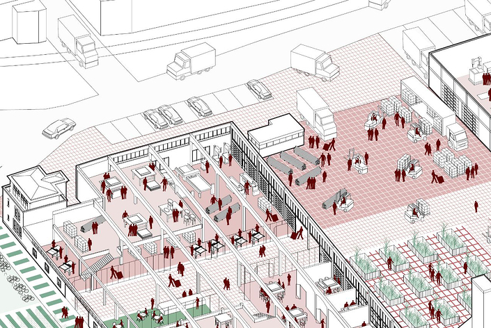 Een sociale werkplaats midden in de wijk Charlois biedt onmiskenbaar voordelen. De rol van Veldacademie is om de sociaal-ruimtelijke opgave verder te onderzoeken. Hoe kan de plek optimaal benut worden voor de omgeving en de mensen die er wonen en werken? Wat is de mate van openbaarheid en menging op zo’n locatie? Is beschutting wenselijk, of is het ook mogelijk een zekere mate van doorloop te prefereren? Om deze vragen concreter te maken zijn twee contrasterende varianten verkend, met een verschillende mate van openbaarheid: ‘zichtbaar maar beschut’ en ‘toegankelijk en gemengd’.
