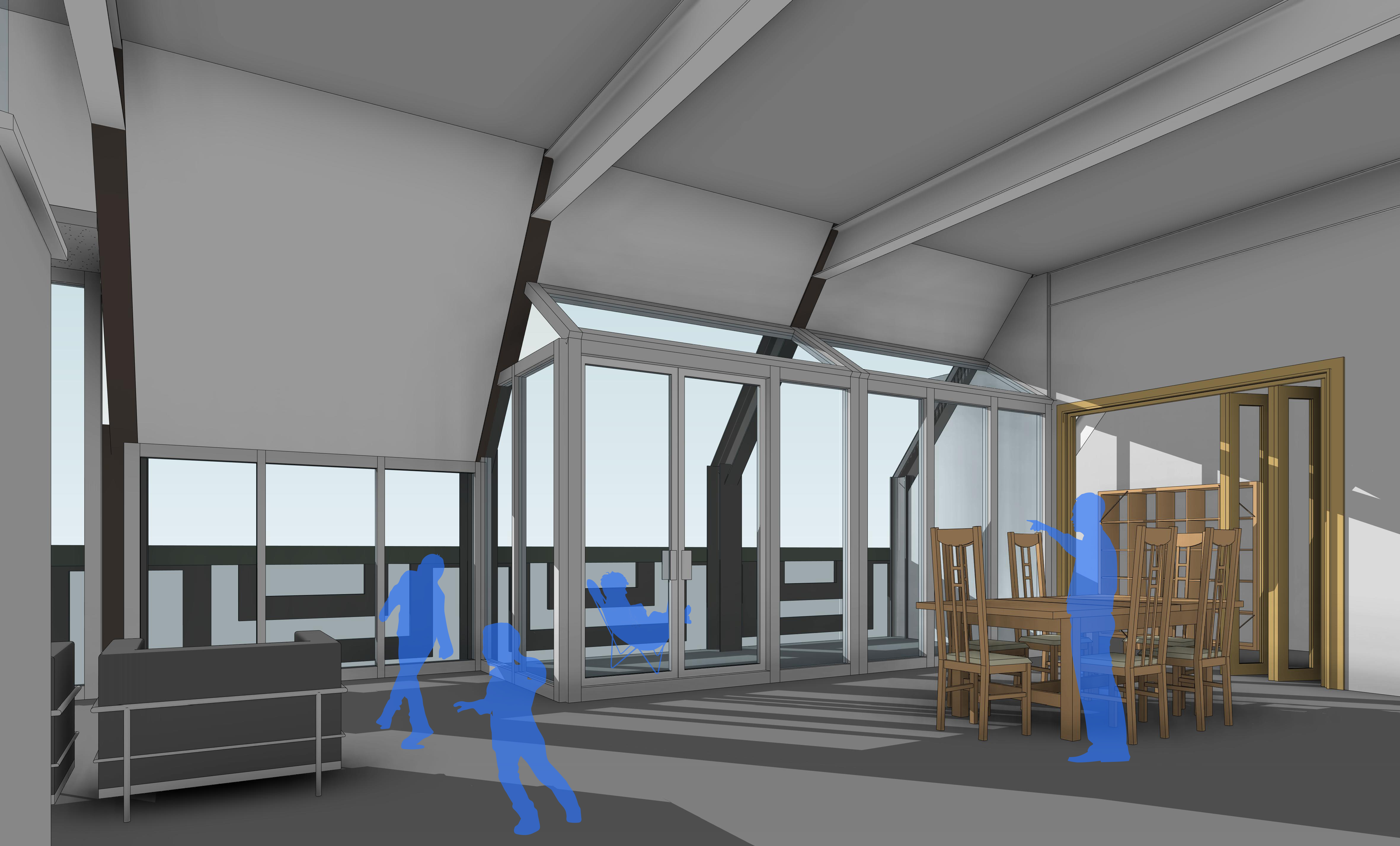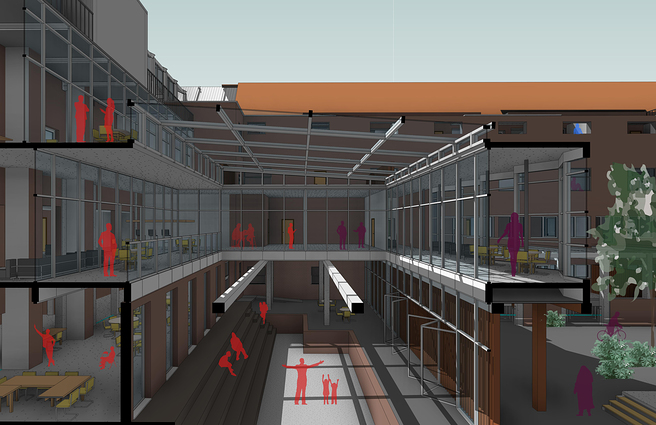 Deze collectieve ruimtes grenzen aan de voormalige aula, die wordt opgebouwd tot atrium. Dit is dé plek in het gebouw waar de verschillende functies samenkomen en waar alle gebruikers elkaar kunnen ontmoeten – net zoals in de oorspronkelijke school. Waar in het huidige gebouw de aula één ruimte op de eerste verdieping is, wordt in het ontwerp juist een opening gemaakt die de verschillende verdiepingen verbindt en afgedekt wordt met een te openen glazen dak. Zo komt er weer licht in de ruimtes erachter (zoals vóór de verbouwing van 1978 ook het geval was), en kan de grote open ruimte in de zomer als buitenruimte worden gebruikt.
