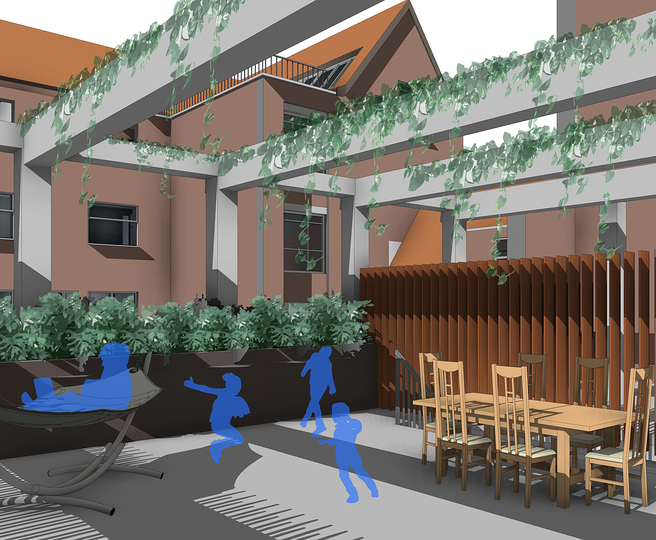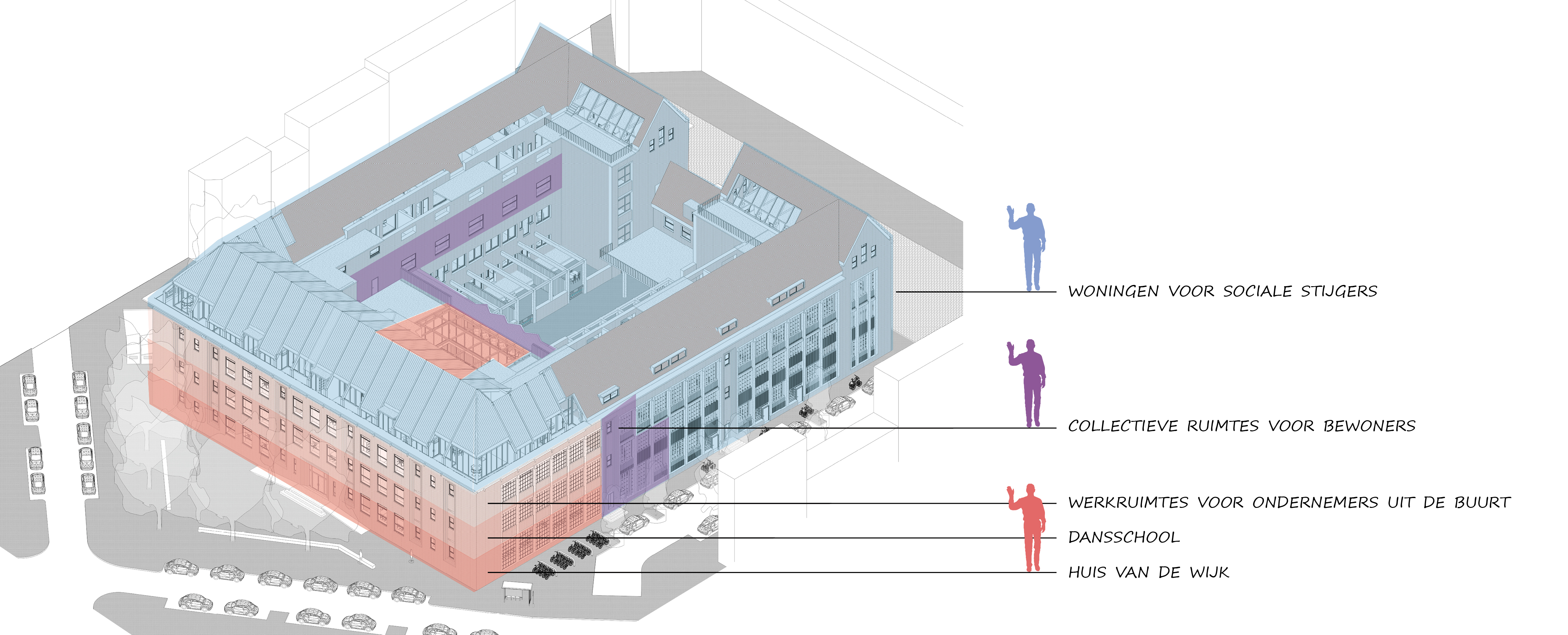 Een van de uitdagingen in het ontwerp was het vinden van de balans tussen scheiding en samenkomst van de verschillende functies. Het bieden van genoeg privacy voor de bewoners als individuen, voor de bewoners als collectief en voor sommige delen van de publieke functies is essentieel voor een geslaagd ontwerp. Tegelijk is het faciliteren van ontmoeting binnen en rondom het gebouw een van de hoofddoelen, onder andere om de sociale binding in de wijk te kunnen bevorderen. De verschillende gebruikers kregen daarom een eigen plek in het gebouw: voor het publieke gedeelte wordt de oorspronkelijke hoofdentree gebruikt en de woningen hebben ofwel een eigen voordeur aan de straat, of kunnen bereikt worden via de gezamelijke entree aan de achterkant van het gebouw. De binnenplaats met de tuinen, dakterassen en loggia’s wordt uit het zicht van het publieke gedeelte onttrokken doordat de ruimtes die door de bewoners collectief gebruikt kunnen worden zich er tussenin bevinden.