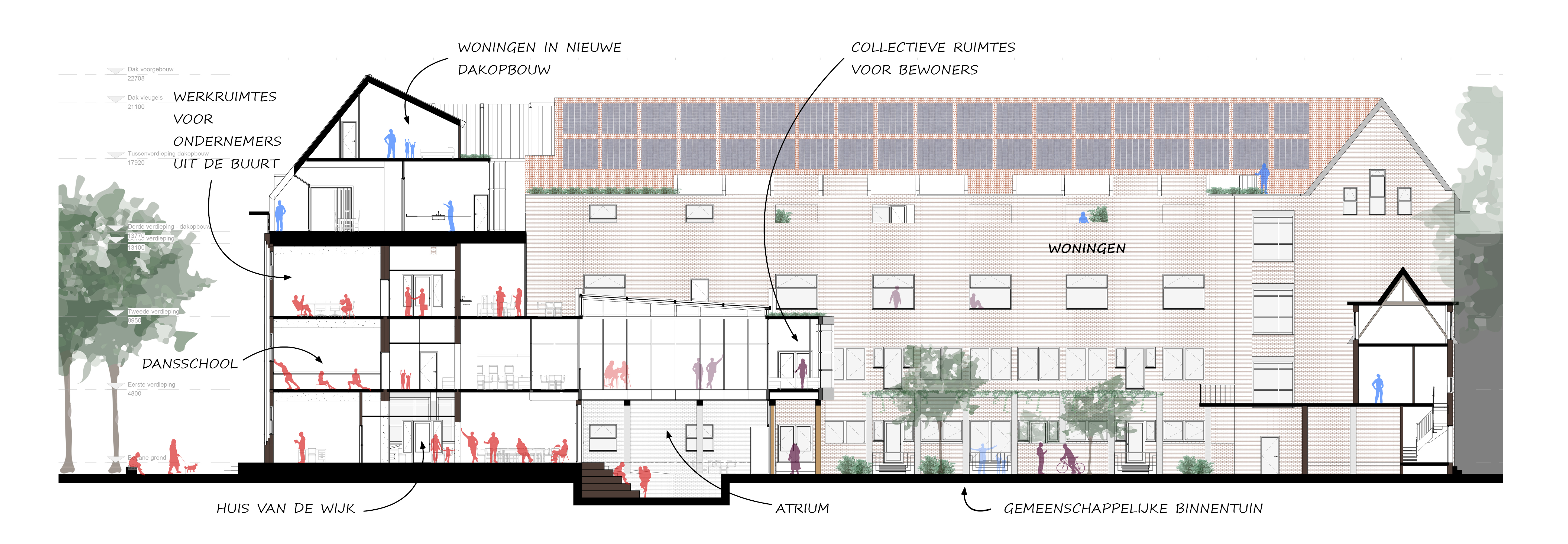 Waar aan de kant van de bewoners de collectieve ruimtes uitkijken over het atrium, grenzen aan de publieke kant op de eerste verdieping de wachtruimte van de dansschool en op de tweede verdieping de kantine van de werkruimtes aan het atrium. Zo dient deze ruimte echt als bufferzone tussen privé en publiek. Op de begane grond bevindt zich de kantine van het Huis van de Wijk, en vanuit hier kan het atrium ook betreden worden. Door het Huis van de Wijk kan de grote open ruimte gebruikt worden als grote zaal, als podiumplek of dus als buitenruimte in de zomer.